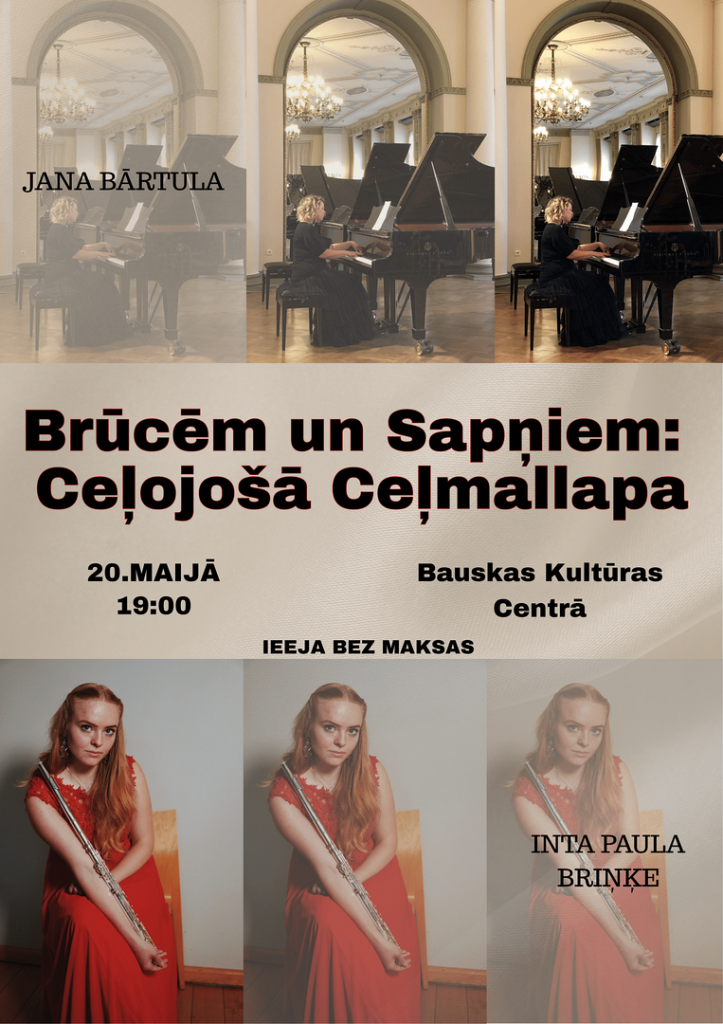 20. maijā plkst. 19.00 Bauskas Kultūras centrā notiks koncerts “Brūcēm un Sapņiem: Ceļojošā Ceļmallapa”, kurā skanēs mūzika flautai un klavierēm.