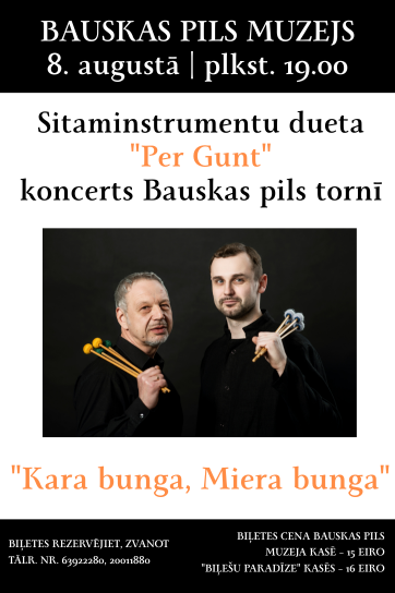 8. augustā plkst. 19.00 Bauskas pils centrālajā tornī izskanēs sitaminstrumentu dueta “Per Gunt” koncerts “Kara bunga, Miera Bunga”.
