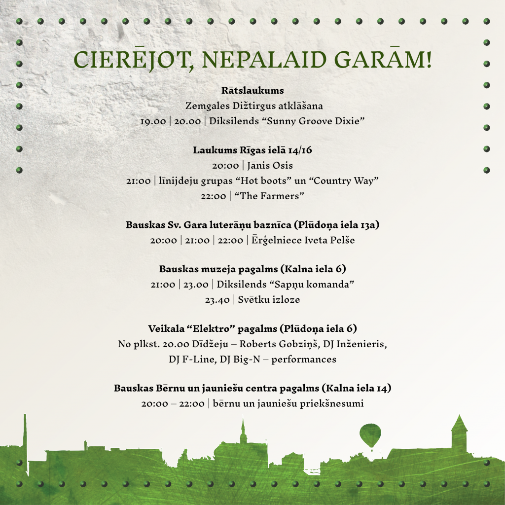 13. septembrī no plkst. 19.00 Bauskas Rātslaukumā norisināsies lielais ZEMGALES DIŽTIRGUS, kas vienkopus pulcēs vairāk nekā 100 mājražotājus un amatniekus no Latvijas malu malām. Savukārt no plkst. 20.00 pilsētas iedzīvotāji un viesi jau piekto reizi tiek aicināti apmeklēt CIERI – nesteidzīgu gaismu un klausāmstāstu pastaigu Bauskas vecpilsētā. Šogad gaismu un stāstu saspēle notiks caurvijoties dažādiem mūzikas žanriem, diksilenda grupām “Sapņu komanda” un “Sunny Groove Dixie”, kantrimūzikas veterānu Jāni Osi, grupu “The Farmers”, ērģelnieci Ivetu Pelši, dīdžejiem Robertu Gobziņu, Inženieri, DJ Big-N, F-Line un ielu muzikantiem.