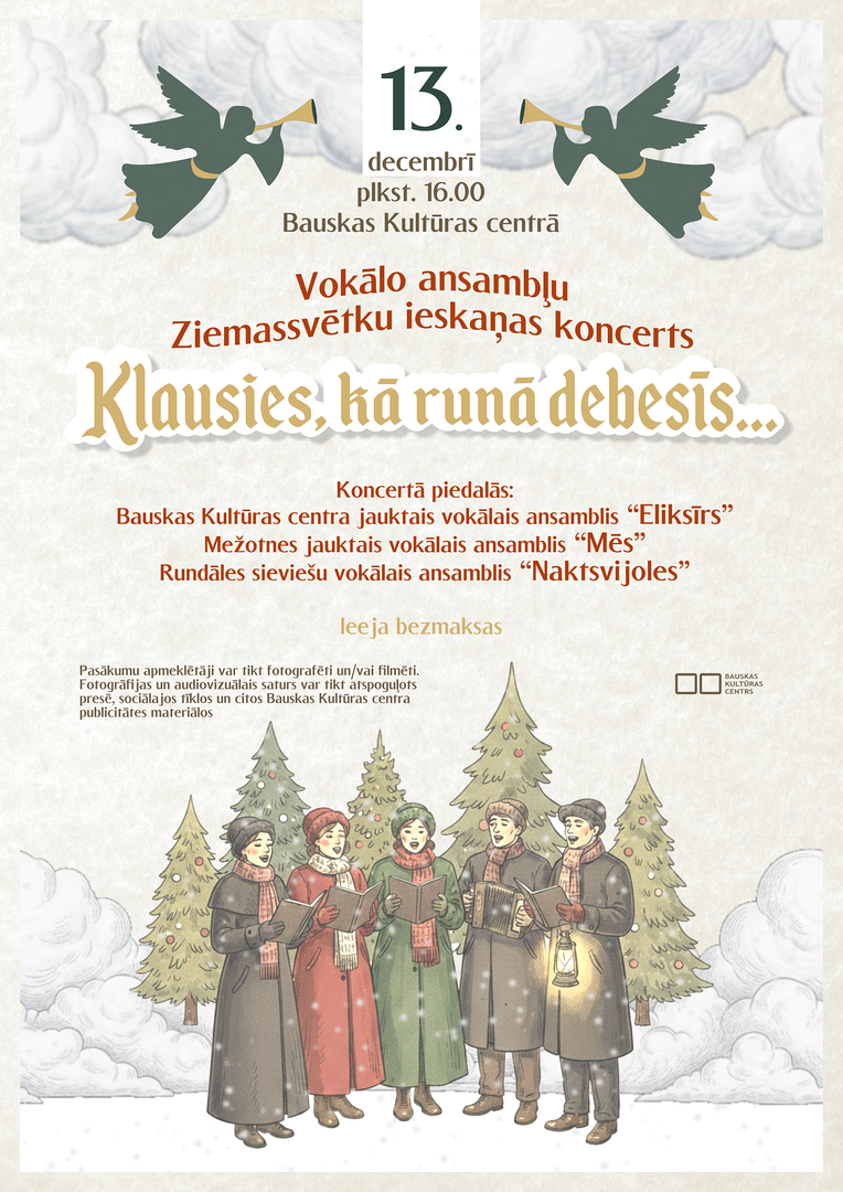 Bauskas Kultūras centra vokālais ansamblis “Eliksīrs” kopā ar Mežotnes jaukto vokālo ansambli “Mēs” un Rundāles sieviešu vokālo ansambli “Naktsvijoles” aicina uz sirsnīgu Ziemassvētku ieskaņas koncertu “Klausies, kā runā debesīs…”.