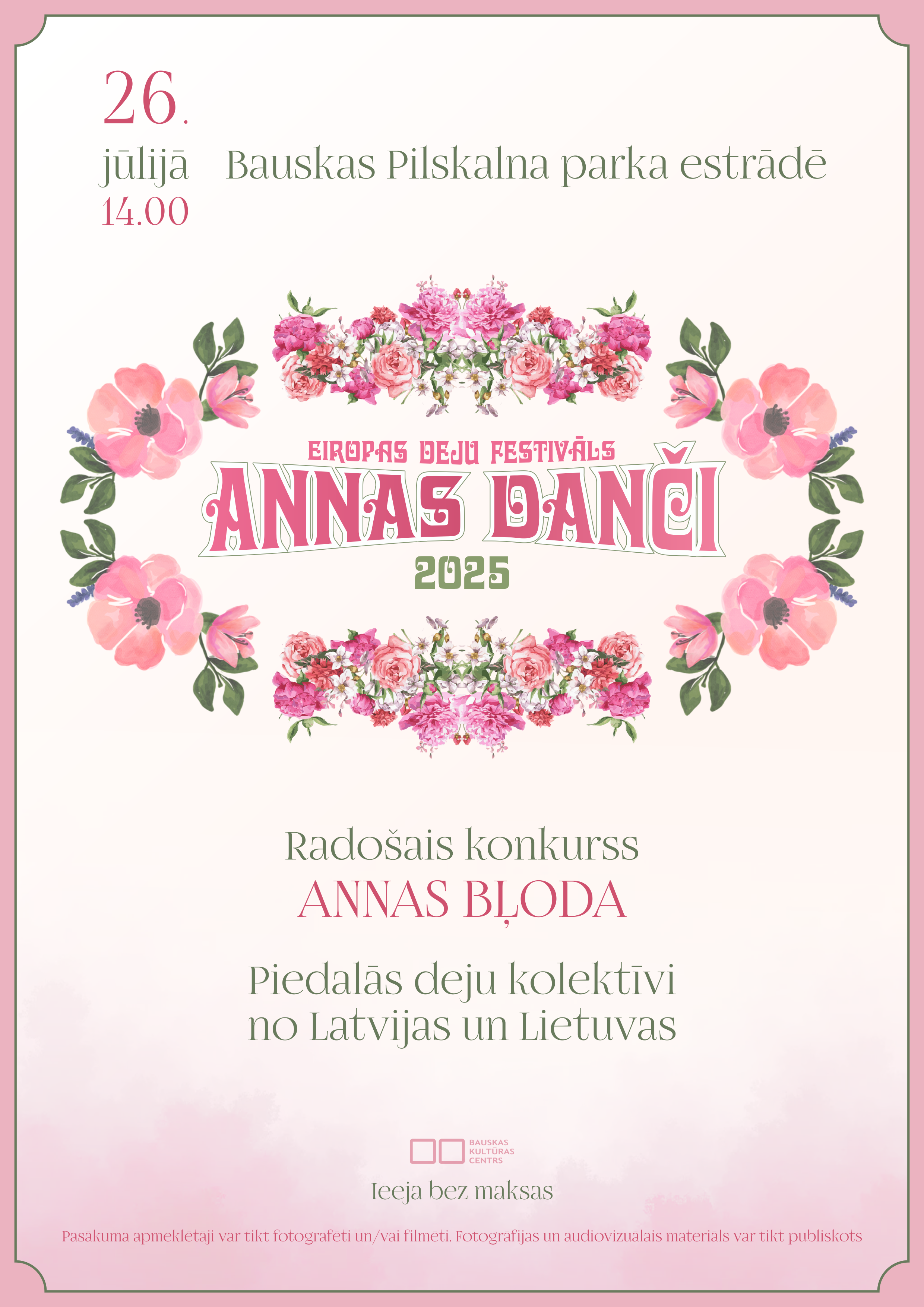 Pasākuma apmeklētāji un dalībnieki var tikt fotografēti un/vai filmēti. Fotogrāfijas un audiovizuālais saturs var tikt atspoguļots presē, sociālajos tīklos un citos Bauskas Kultūras centra publicitātes materiālos nākotnē.