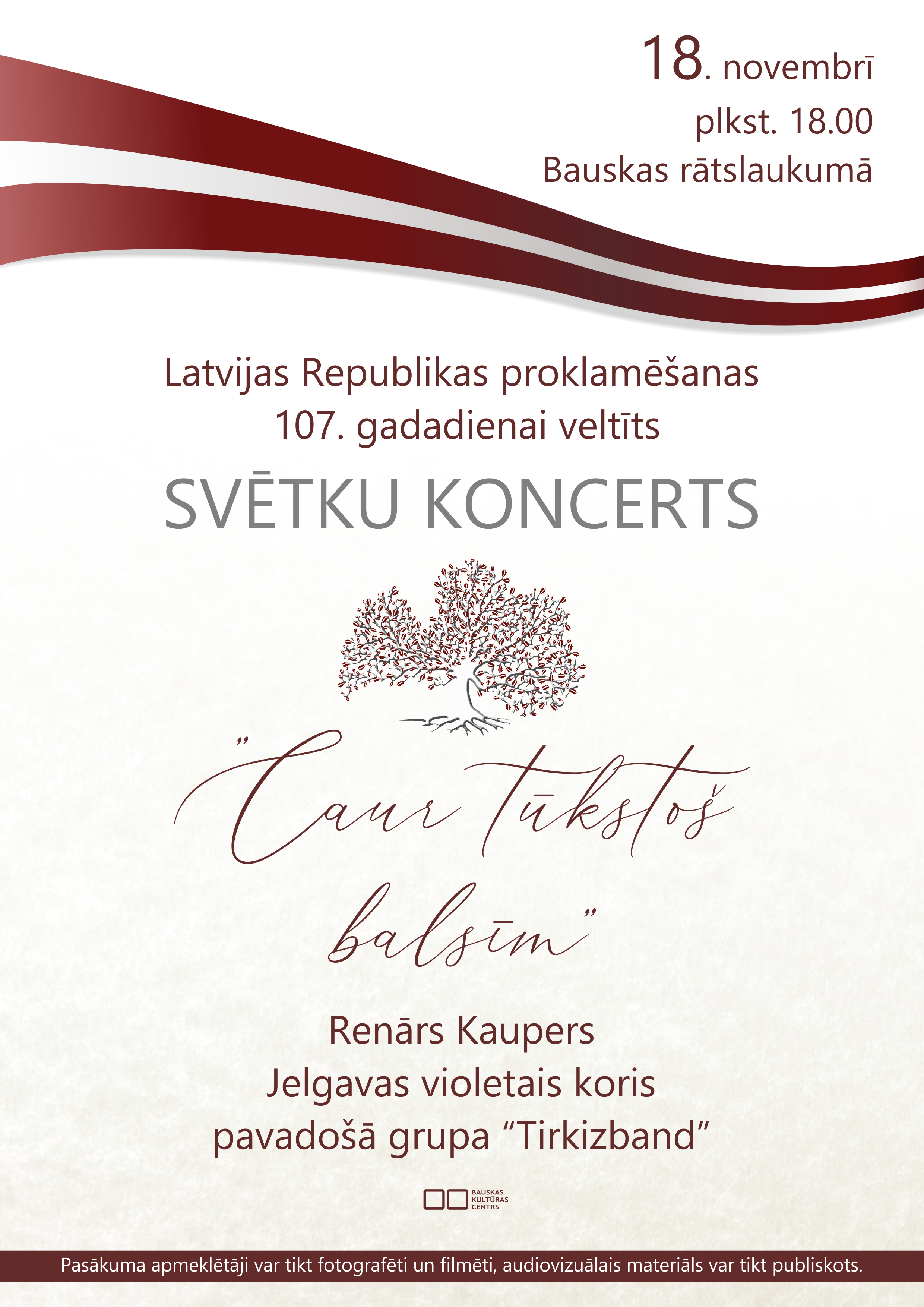 18. novembrī plkst. 18.00 pilsētas iedzīvotāji, novadnieki un citi interesenti tiek gaidīti Bauskas rātslaukumā uz Latvijas Republikas proklamēšanas 107. gadadienai veltītu svētku koncertu “Caur tūkstoš balsīm”.
