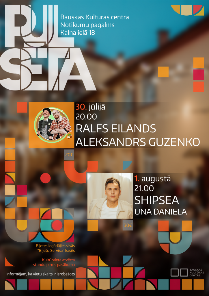 1. augustā plkst. 21.00 uz sirsnīgu satikšanos mājīgajā pagalmā aicina SHIPSEA. “Pulsētas” koncertā tiks atskaņoti tādi SHIPSEA oriģināldarbi kā “Pie upes”, “Tavi viļņi”, “Siltā gaismā”, kas jau iemantojuši klausītāju atzinību. Programmu papildinās arī skaistākās melodijas, ko savulaik radījis Imants Kalniņš, Pīters Geibriels un citi komponisti. SHIPSEA koncertā uzstāsies duetā kopā ar jauno, talantīgo dziedātāju Unu Danielu. Biļetes cena – 30 eiro.