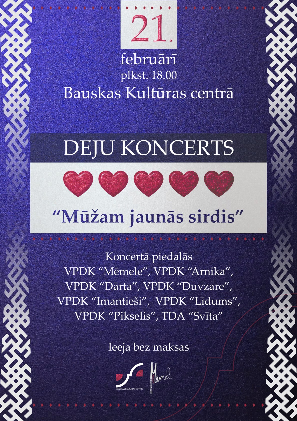 21.februārī plkst. 18.00 vidējās paaudzes deju kolektīvs “Mēmele” skatītājus aicina uz tradicionālo sadanci “Mūžam jaunās sirdis”.
