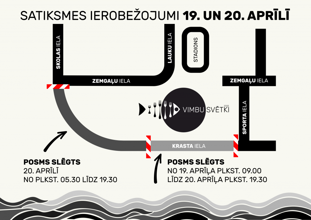 Vēršam uzmanību, ka svētku uzbūves dienā un “Vimbu svētku” laikā tiks noteikti satiksmes ierobežojumi. No 19. aprīļa plkst. 09.00 līdz 20. aprīļa plkst. 19.30 transporta līdzekļu kustība nebūs iespējama Krasta ielas posmā gar Bauskas pilsētas stadionu. 20. aprīlī no plkst. 05.30 līdz plkst. 19.30 Krasta iela tiks slēgta posmā no Sporta līdz Skolas ielai.
