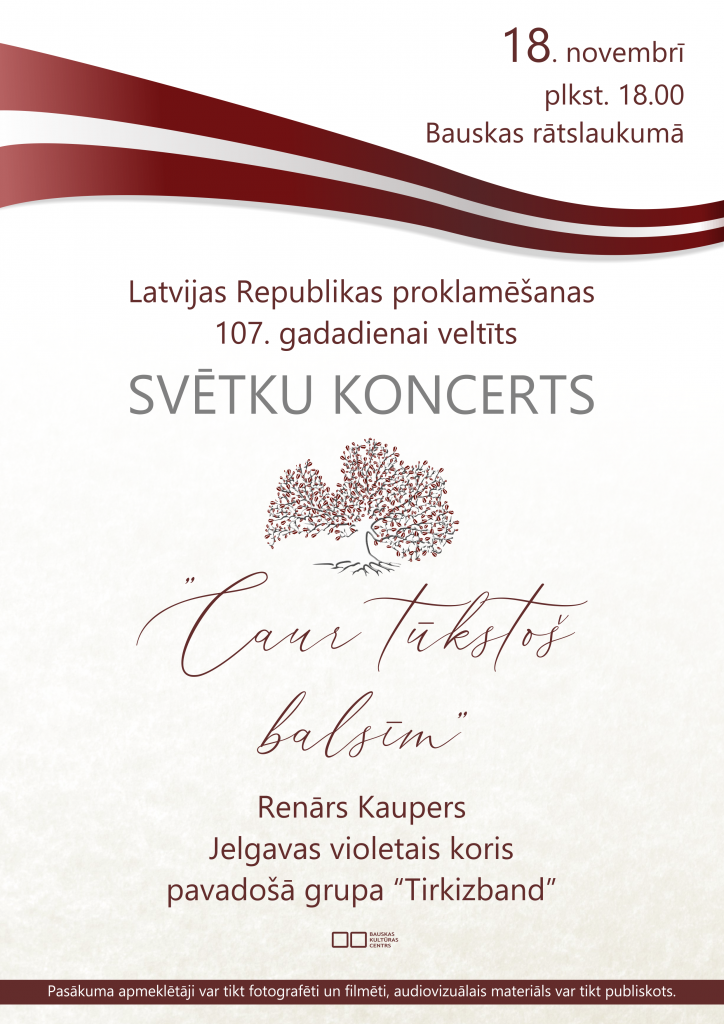 Pasākumu apmeklētāji var tikt fotografēti un/vai filmēti. Fotogrāfijas un audiovizuālais saturs var tikt atspoguļots presē, sociālajos tīklos un citos Bauskas Kultūras centra publicitātes materiālos nākotnē.