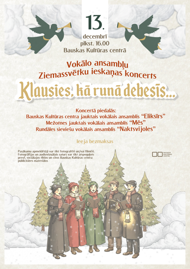 Dienu pirms trešās adventes, 13.decembrī plkst. 16.00 kultūras centrā jauktais vokālais ansamblis “Eliksīrs” un draugu kolektīvi izpildīs skaistākās Ziemassvētku dziesmas koncertā “Klausies, kā runā debesīs…”.